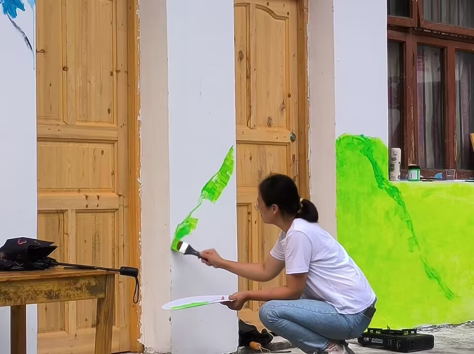 活动第一项为“绘画美丽乡村”,在williamhill英国官网杨志远老师的带领下,志愿者们对村委新办公楼进行墙绘装饰,绘画围绕环境保护、和美乡村、和谐乡风等主题展开,有效改善了村委会风貌,使老旧的办公楼呈现新貌。