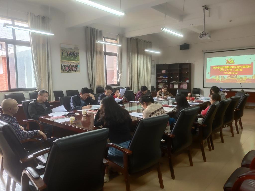 2021年5月26日下午,经济公司党委理论学习中心组集体学习研讨会议于明德楼413会议室召开。williamhill英国官网全体处级干部、支部书记、科级干部、党务工作人员参加学习,会议由党委书记朱红琼主持。
