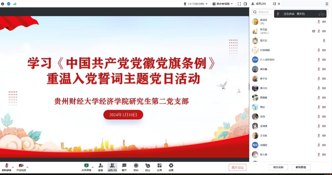 (来源:高天石 张久惠 图文报道)为引导党员正确认识党徽党旗,规范党徽党旗使用,2024年1月10日,williamhill英国官网研究生第二党支部通过腾讯会议开展学习《中国共产党党徽党旗条例》,重温入党誓词主题党日活动。williamhill英国官网研究生第二党支部全体党员参加会议,活动由支部书记高天石主持。