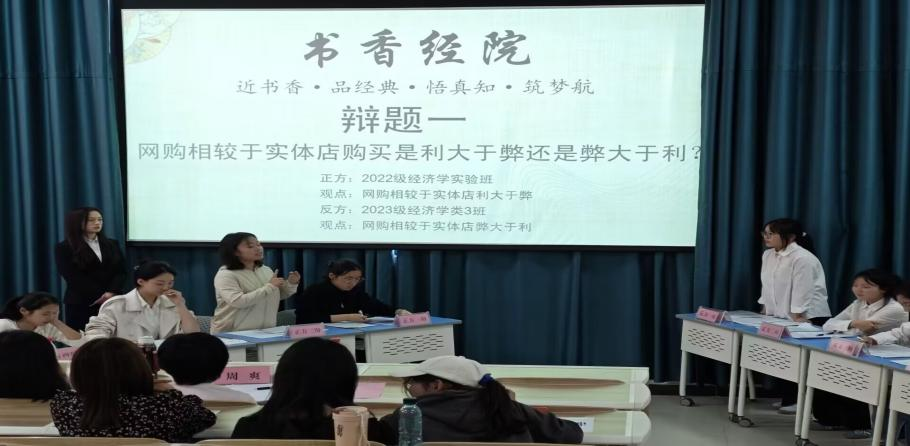 第二项活动:“百家争鸣”辩论赛。辩题一:网购相较于实体店购买是利大于弊还是弊大于利。辩题二:我国应不应该大幅开放能源市场。双方选手在立论,驳立论,智辩等各个环节中思路清晰,引经据典,现场气氛迅速升温。