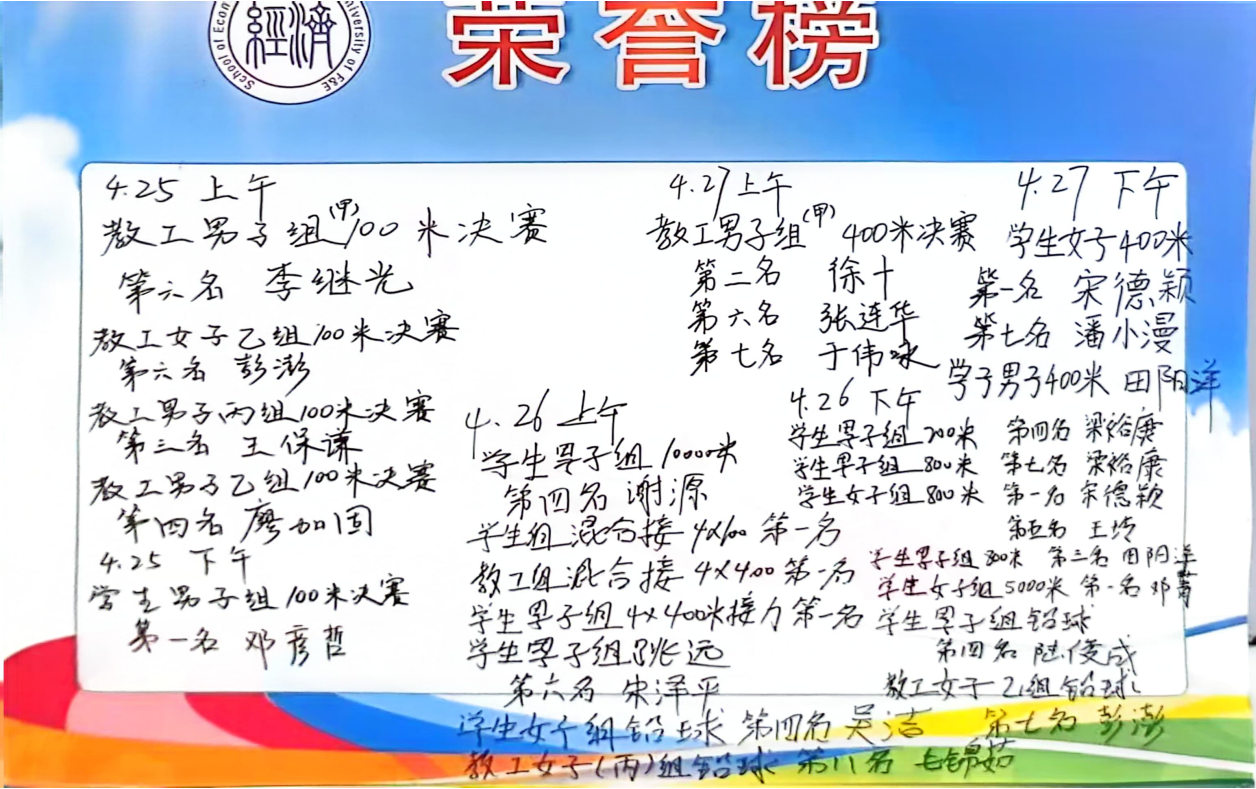 邓菁 5000米第一名,获优秀运动员称号 宋德颖 800米第一、400米决赛第一