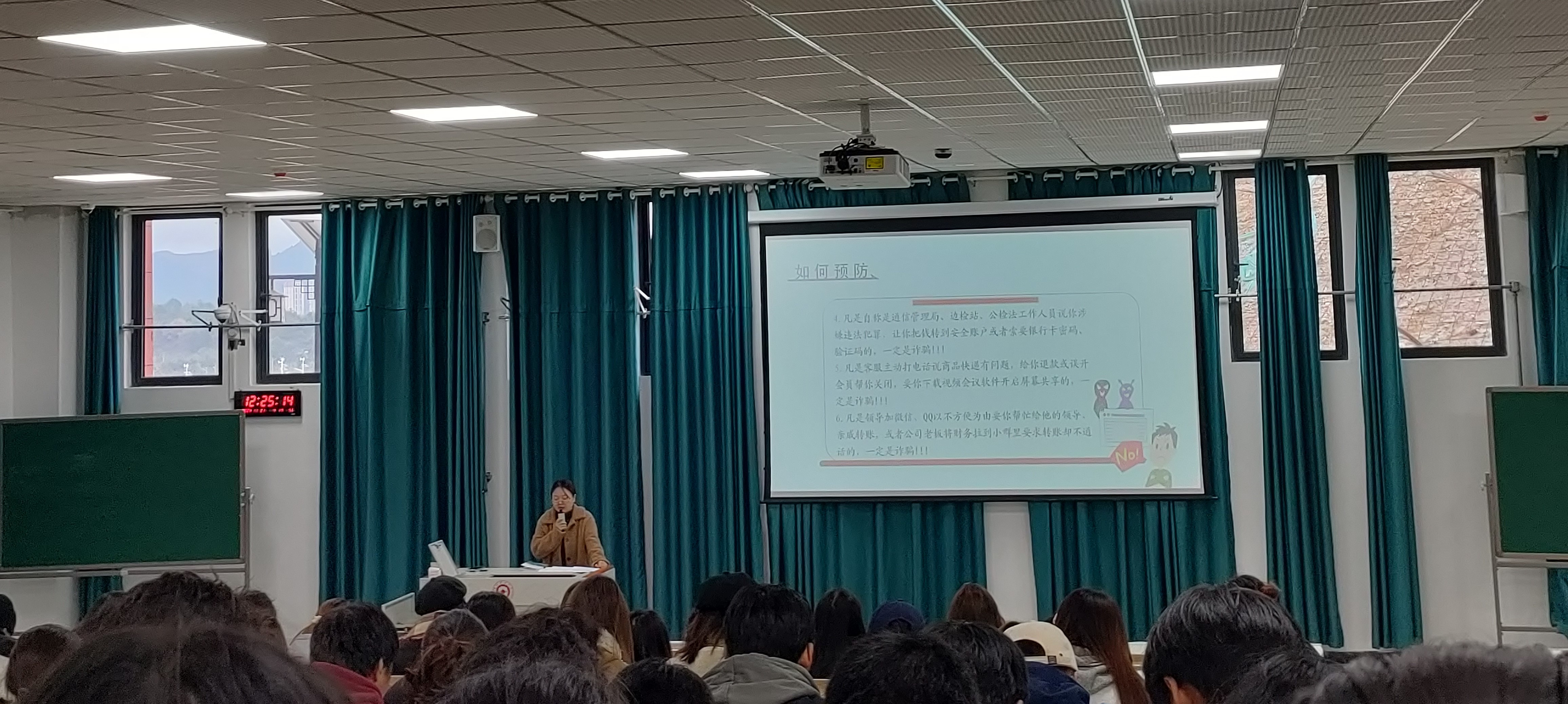 本科22级辅导员刘梦燕跟同学们进行交流,了解同学们的心理状况和情绪变化,帮助同学们缓解压力,正确面对挫折和失败。强调了关于冬季寝室用电安全、预防传染病、预防诈骗、保护个人隐私等方面问题。