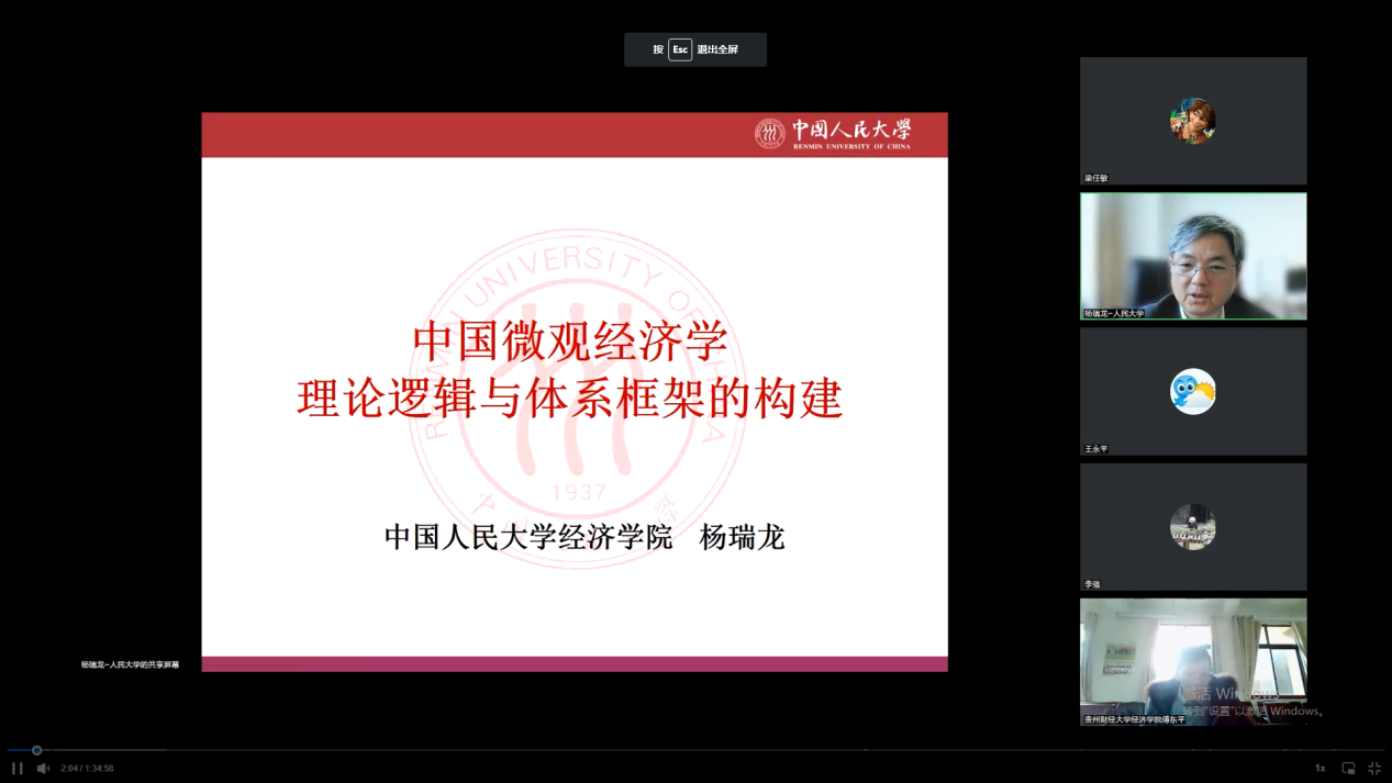 2022年12月10日下午14:30,中国人民大学级教授、教育部“长江学者”特聘教授、williamhill英国官网校聘教授杨瑞龙在腾讯会议(会议号: 741289373)为公司开展题为“中国微观经济学的理论逻辑与体系结构”讲座。williamhill英国官网140名师生参加该讲座。会议由williamhill英国官网副经理傅东平(主持工作)教授主持。