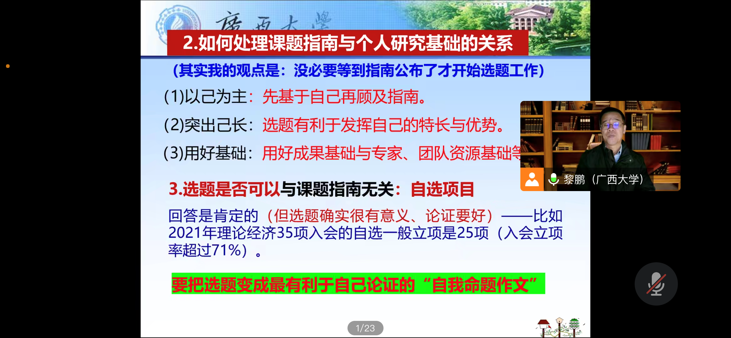 黎鹏教授从态度问题,如何提升选题质量的思考维度以及论证问题三个部分来进行剖析讲解。强调了申报课题要摆正心态,要抓稳自己适合的,自己喜欢的课题进行申报,切勿形成“被逼”申报课题心态。要求在“心态加持”的条件下,要牢牢把握“两个根本”——根本之一:提升自信与激起热情下奋力投入;根本之二:方法正确与标准过硬。同时黎鹏教授强调了,要让申报的课题有特色,有思想深度就得先确定一个优秀的题目,一定要结合自己的科学问题导向。除此之外,黎鹏教授还指导我们要稳抓“实践推高”与“理论推高”两个方面,列举了一些例子详细进行了说明。最后在申报标书的问题上进行详细指导。为参加讲座的师生们提供了宝贵而深刻的逻辑思路。