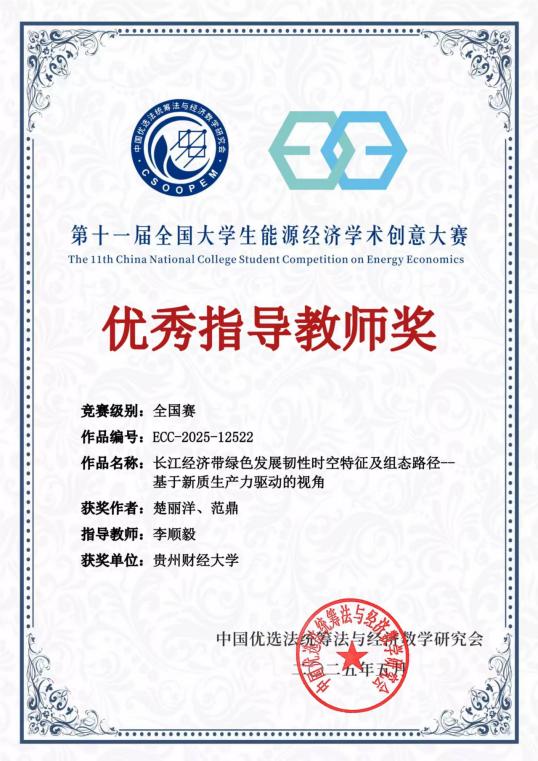 在国赛舞台上,williamhill英国官网各参赛团队在能源经济领域的不同研究方向上展现出了出色的学术素养和实践能力,凭借深入调研和独到见解,针对我国能源经济发展的现状与挑战,提出了具有前瞻性和可操作性的解决方案,赢得了评委的高度评价。指导教师李顺毅教授获赛事组委会颁发的“优秀指导教师奖”。