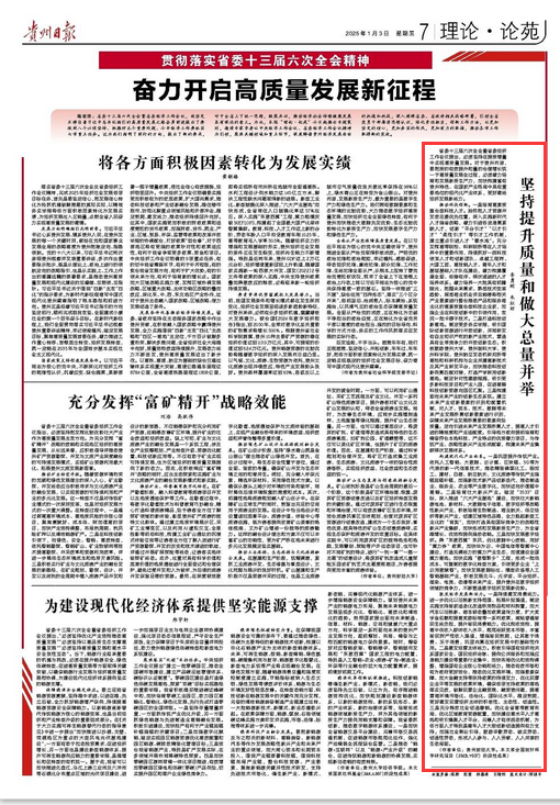 省委十三届六次全会暨省委经济工作会议提出,必须坚持在提质增量中实现高质量发展。对于贵州而言,要把质的有效提升和量的合理增长统一于高质量发展全过程,必须着力培育和发展新质生产力,加快构建富有贵州特色、在国家产业格局中具有重要地位的现代化产业体系,更好激活经济发展新活力。